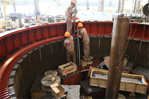 青田小溪和重慶雙江作為公司的兩個(gè)重點(diǎn)項(xiàng)目,從七月開(kāi)始逐步進(jìn)入裝配階段,為了能夠確保整個(gè)裝配過(guò)程順利進(jìn)行,總裝成品部在導(dǎo)水機(jī)構(gòu)、定子、轉(zhuǎn)輪、轉(zhuǎn)子等大部件進(jìn)入裝配前便制定了詳細(xì)的生產(chǎn)計(jì)劃,同時(shí)積極與生產(chǎn)制造部溝通零部件成套,對(duì)部件裝配場(chǎng)地進(jìn)行合理布局,為兩個(gè)項(xiàng)目能夠順利裝配提供了保障。定子鑲筋和壓定人員為了保證工期,在較為密閉的機(jī)座內(nèi)揮汗如雨,但仍一絲不茍地完成每一個(gè)工序。導(dǎo)水機(jī)構(gòu)裝配在導(dǎo)葉掛裝時(shí)需長(zhǎng)期占用行車(chē),為保證其它工序地順利進(jìn)行,水機(jī)裝配人員白天進(jìn)行轉(zhuǎn)輪裝配、軸瓦研刮等工序,晚上加班進(jìn)行導(dǎo)葉的掛裝。
